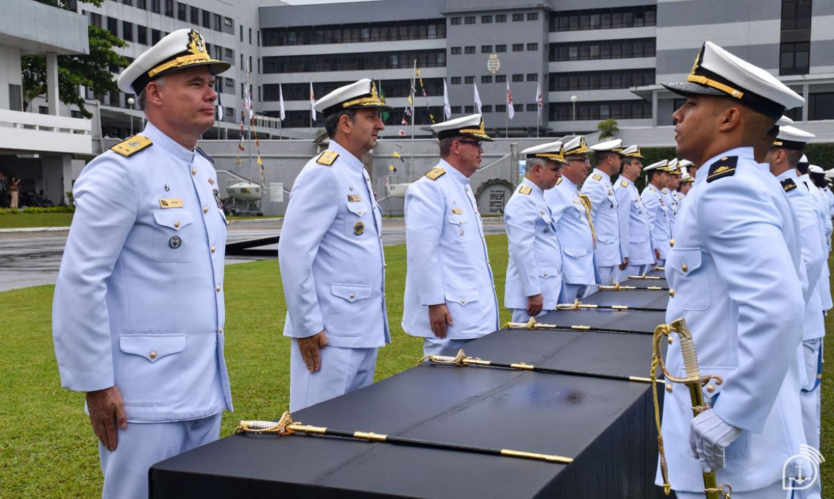 Plano médio de uma cerimônia militar oficial da Marinha do Brasil. Fileiras de Oficiais da Marinha, em pé e em continência, vestindo o uniforme branco de gala com insígnias douradas e quepe. Eles estão perfilados sobre um gramado verde, olhando para a direita. No centro da imagem, sobre uma longa mesa coberta por um pano preto, estão várias espadas cerimoniais com cabos e bainhas douradas, prontas para serem entregues. Ao fundo, vê-se um grande edifício militar cinza e branco e várias bandeiras hasteadas. No canto inferior direito, há uma pequena marca d'água com o símbolo da Marinha. A luz é natural e de um dia nublado.